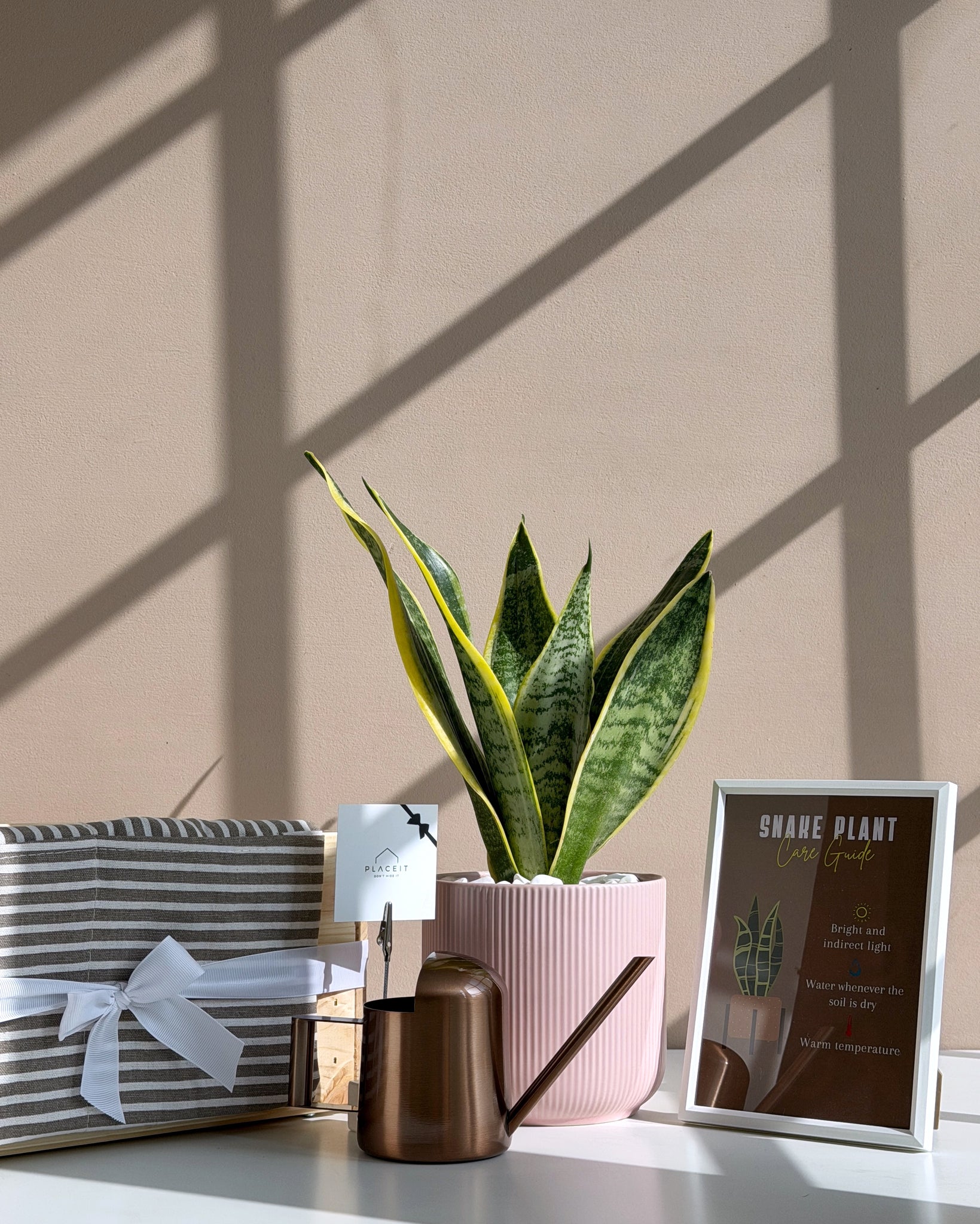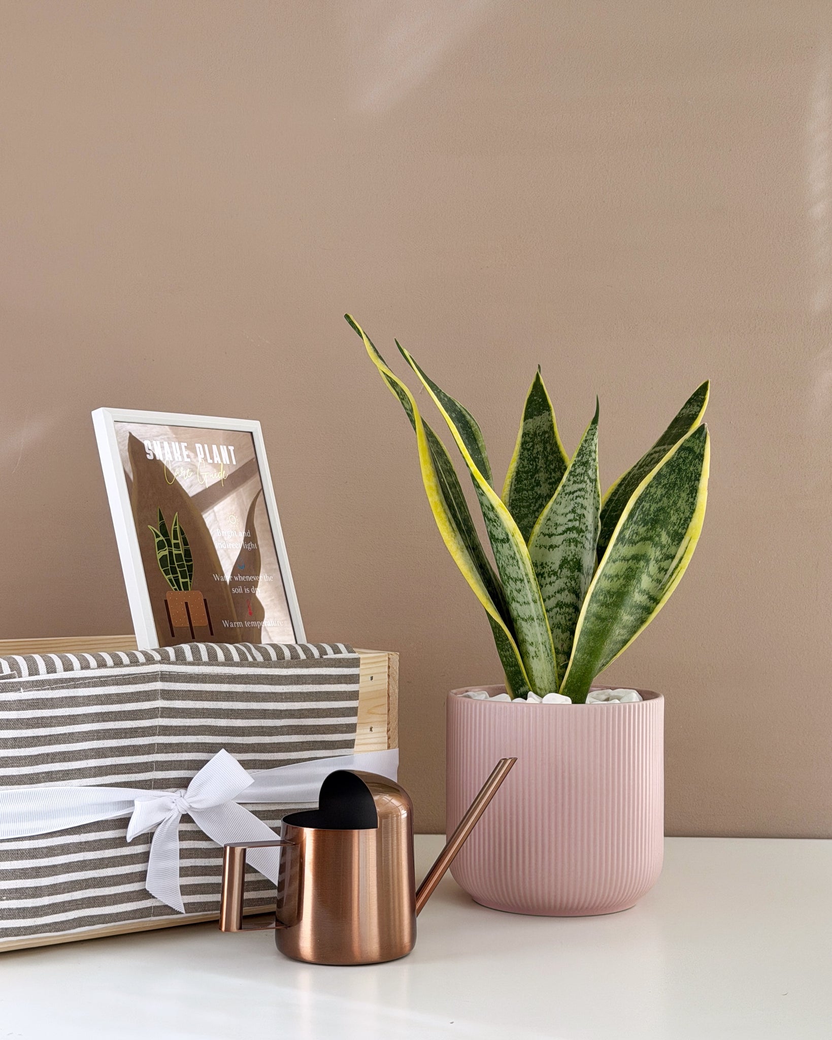 A fresh and modern gift set featuring a live Snake Plant in a pink pot, a metal watering can, and a framed care guide — all arranged in a wooden crate and paired with a striped garden apron tied with a white ribbon, perfect for home décor lovers, new plant owners, or thoughtful gifting.